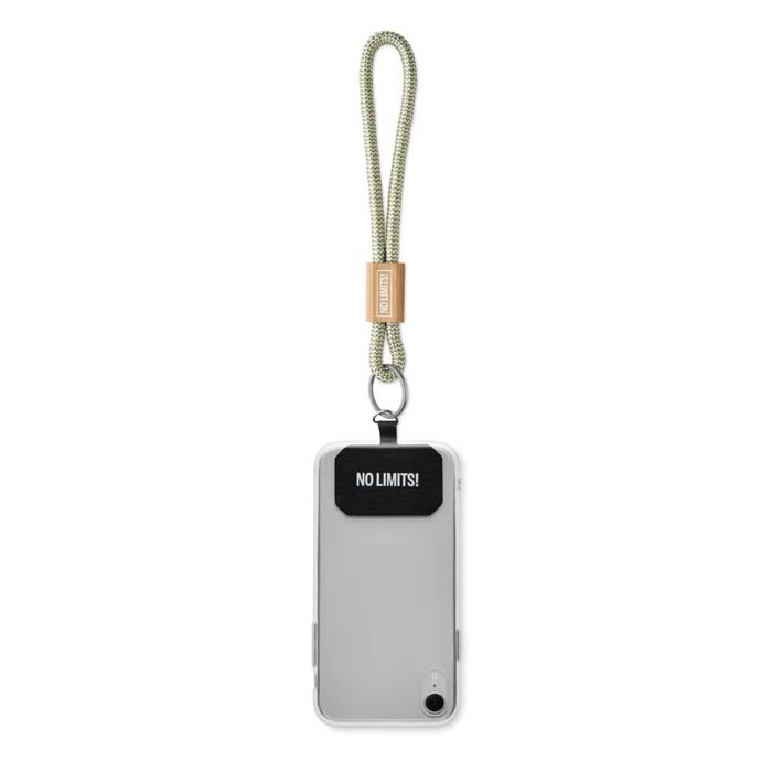 ¡Que no se te caiga el teléfono! Esta correa corta de un solo cordón se puede poner alrededor de la muñeca y viene con un parche cuelga móvil de poliéster con anilla metálica.