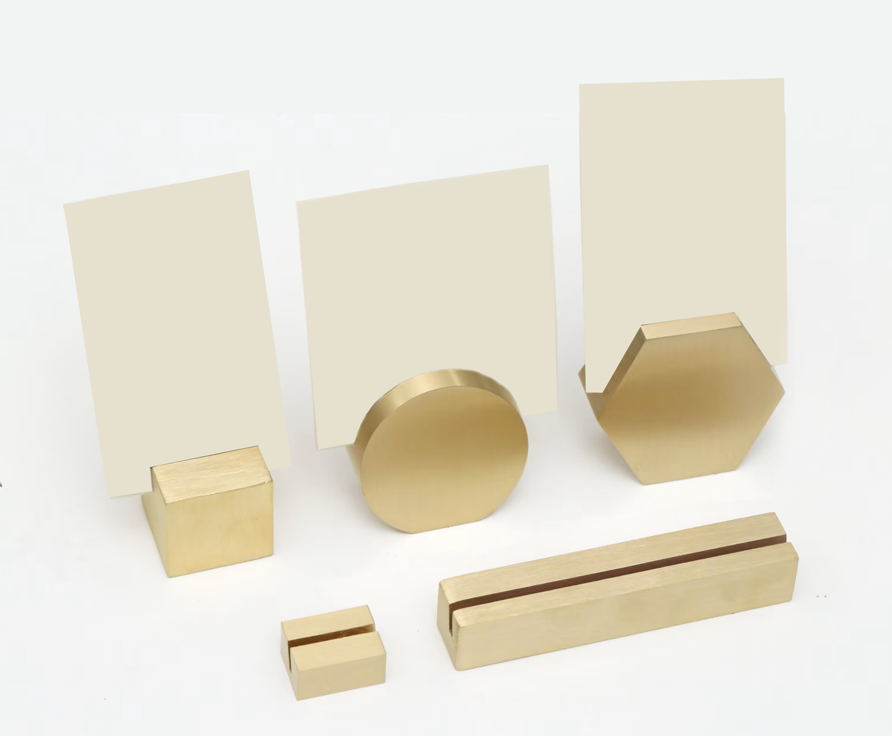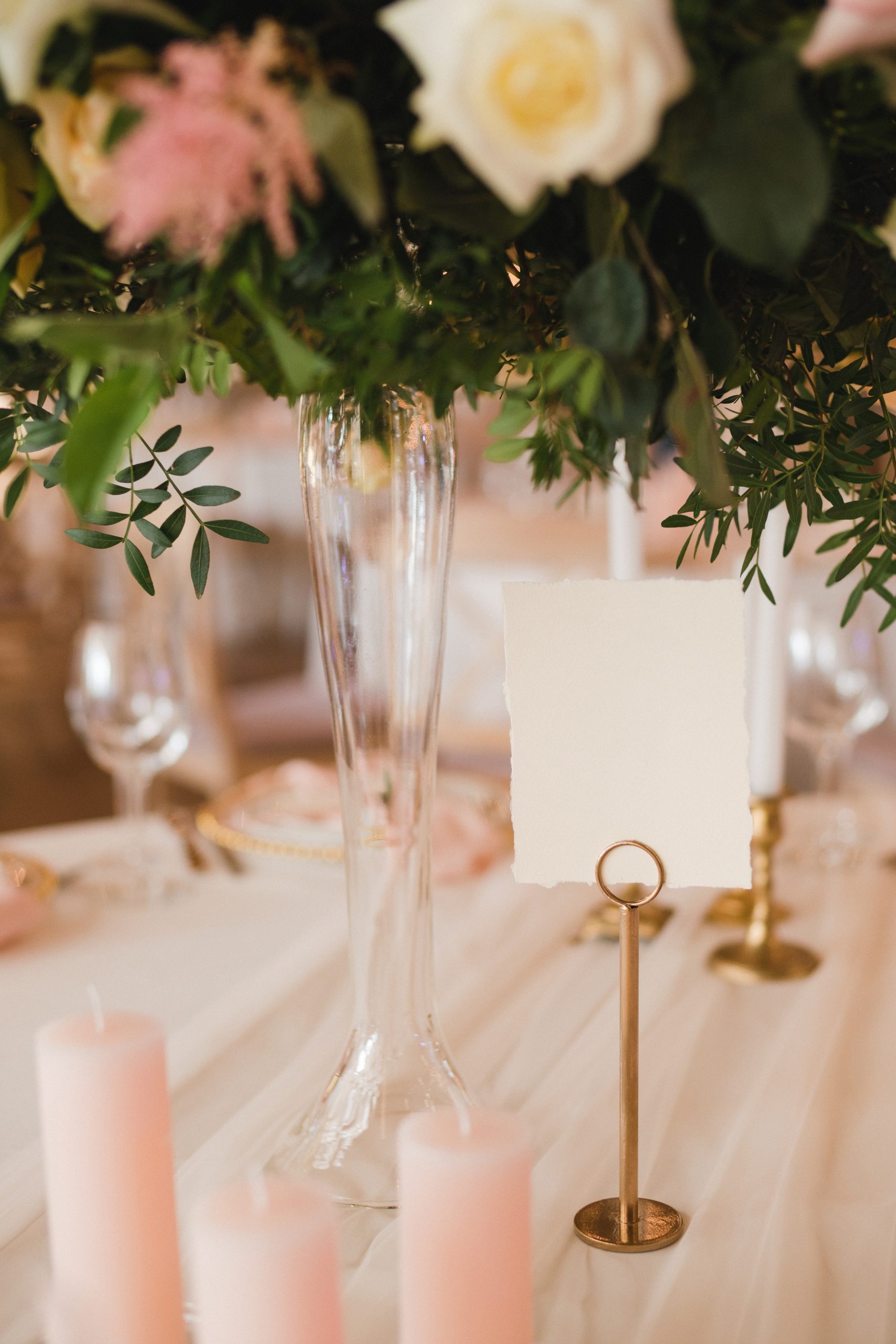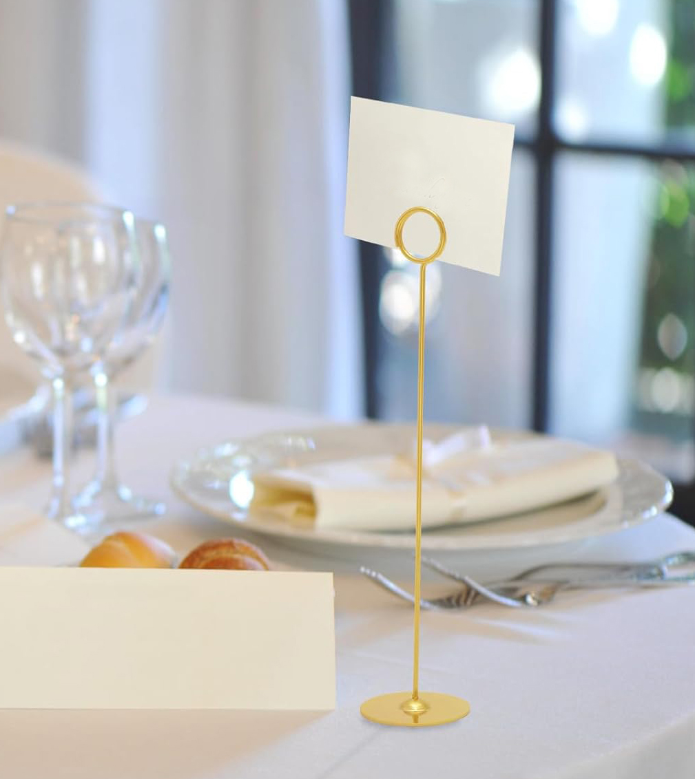 Peanas, soportes porta tarjetas de metal, madera o mini pizarras elegantes y eco sostenibles para señalización de mesas. Detalles que realzan la presentación de los nombres o números asignados en bodas y eventos.